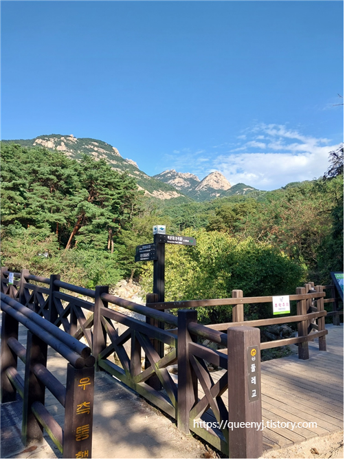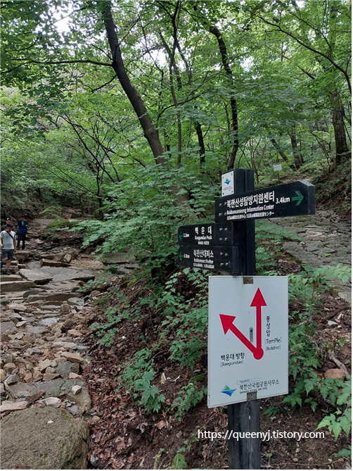 북한산국립공원 입구에서 별로 힘들지 않은 경사길을 쭈욱 오르다보면 백운대로 가는 가파른 길(2.6km)와 완만한 길(4.1km)의 갈림길이 나온답니다.